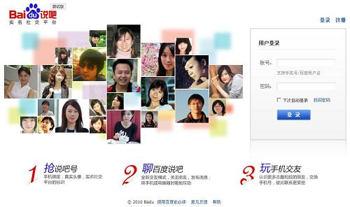 2010年9月16日消息,百度旗下第一款社交網(wǎng)絡(luò)產(chǎn)品“百度說吧”(t.baidu.com)悄然上線開始全網(wǎng)邀請測試。定位于實名社交和交友平臺。