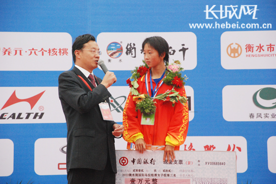河北選手尹媛媛獲得2012衡水湖馬拉松賽女子全程馬拉松季軍。扈煒 攝